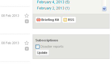 Only when you log in can you see an option at the bottom of the filters on country and disaster pages that allows you to subscribe to report updates. For example, if you go to the South Sudan country page and check the box, you will get an email every day with links to all the new reports and maps on the South Sudan crisis posted on our site. If you’re interested in following the relief and recovery efforts for Typhoon Haiyan/Yolanda in the Philippines, you only need to go to the disaster page and check the box there.